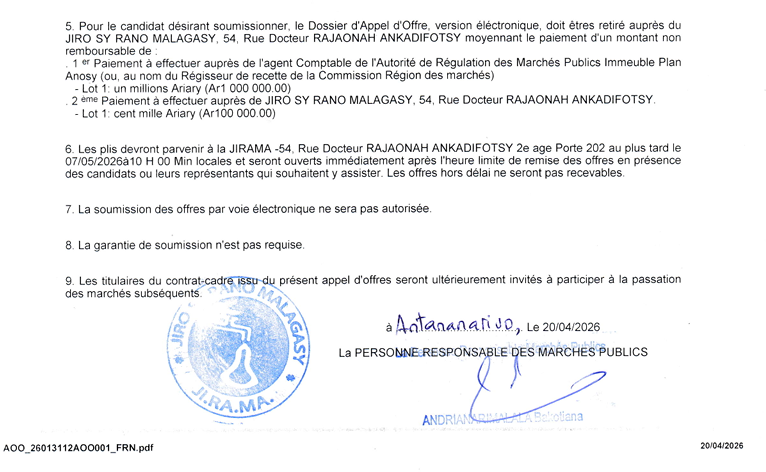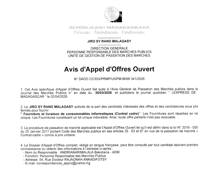 Appel à Manifestation d’Intérêt N° AMI/DG/PRMP/UGPM-M/N° 98 348/2026 : Sélection d’un Cabinet de recrutement pour les cadres dirigeants de la JIRAMA