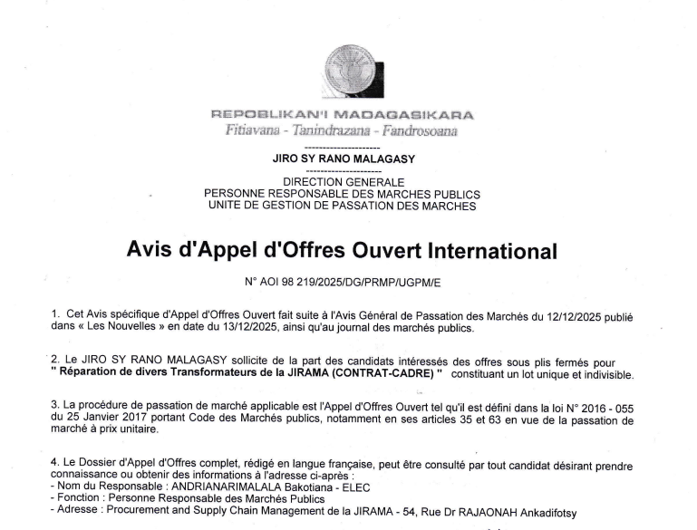 Avis d’Appel d’Offre Ouvert International AOI 98 219/2025/DG/PRMP/UGPM/E – Réparation de divers transformateurs