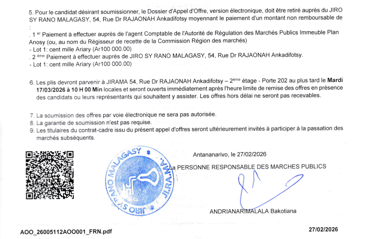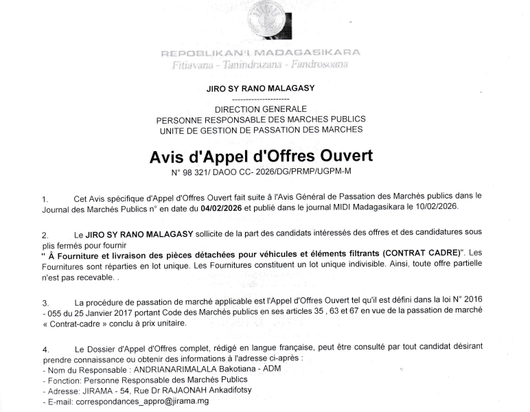 Avis d’appel d’offres DAOO CC 98 321-M Fourniture et livraison des pièces détachées pour véhicules et éléments filtrants Publié le :27 février 2026 Avis-dAppel-dOffre-98-321-MTélécharger