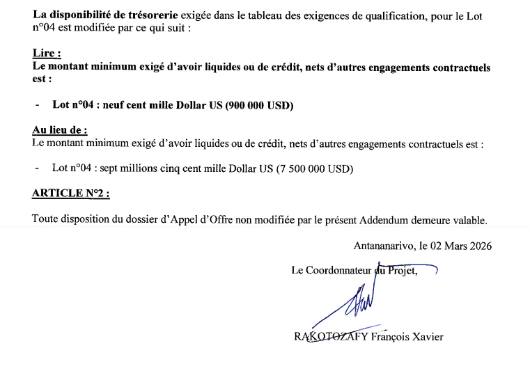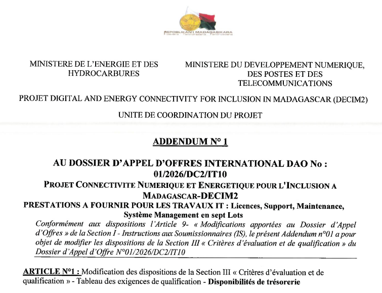 Avis d’Appel d’Offres International ADDENDUM N°2 au DAO N°01/2026/DC2/IT10 – DECIM2 Publié le :5 mars 2026 ADDENDUM-N°1-DAO-N°01-2026-DC2-IT10-DECIM2-1Télécharger