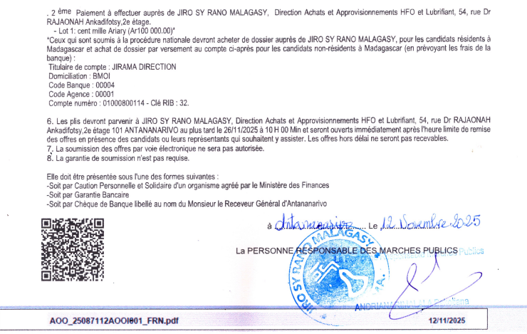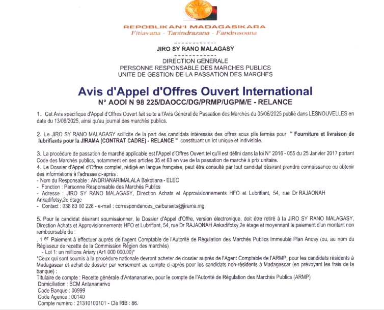 Avis d’appel d’offres International N°AOOI 98 225/DAOCC/DG/PRMP/UGPM/E-Relance : Fourniture et livraison lubrifiants Publié le :13 novembre 2025 AOI-INTERNATIONALTélécharger