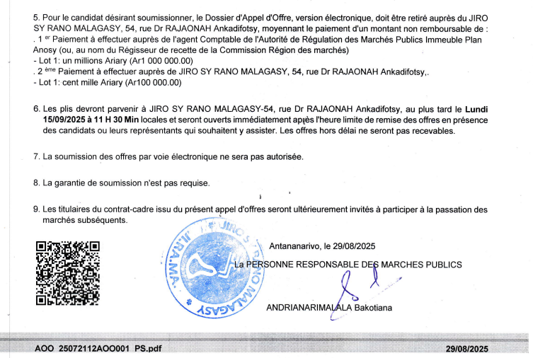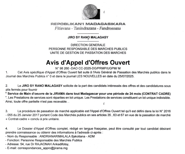 Avis d’Appel d’offres N° 98 260/DAOO CC-2025/DG/PRMP/UGPM/M – Service de main d’œuvre de la JIRAMA dans tout Madagascar Publié le :29 août 2025 Avis-dappel-doffre-98-260-MTélécharger