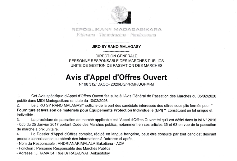 Avis d’appel d’offres N° 98 313/DAOO-2026/DG/PRMP/UGPM-M : Fourniture et livraison de matériels pour Equipements Protection Collective