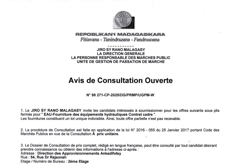 Avis de Consultation Ouverte N°N’ 98 271.CP-2025/DG/PRMP/UGPM-W EAU-Fourniture des équipements hydrauliques