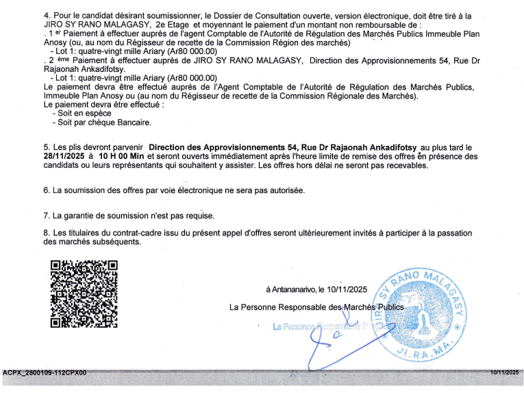 Avis d’Appel d’Offres Ouvert International N°AOI 98 261/2025/DG/PRMP/UGPM/E – Fourniture et livraison de Pièces Consommables et de Sécurité Publié le :17 novembre 2025 Avis-de-Consultation-Ouverte-98171-W_20251114_0001-1Télécharger