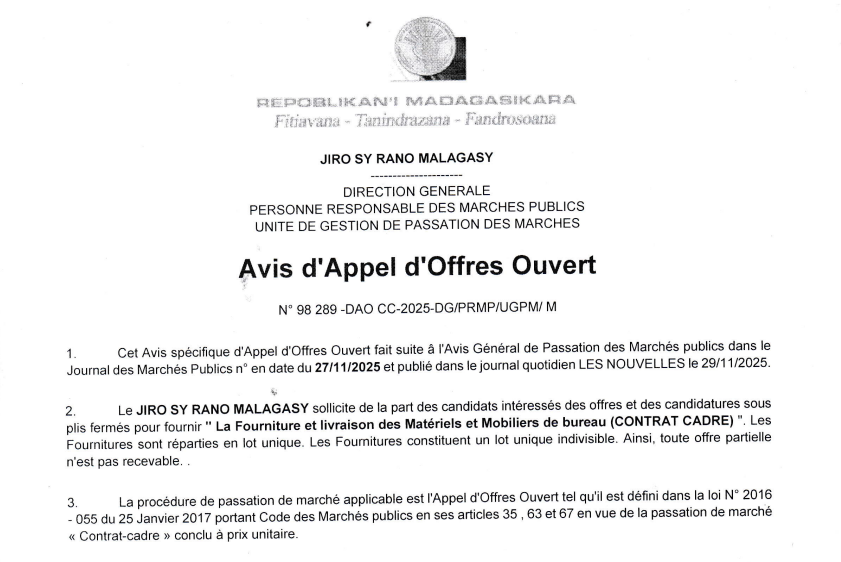 Avis d’Appel d’Offres Ouvert N° 98 289 DAO CC-2025-DG/PRMP/UGPM/ M Fourniture et livraison des Matériels et Mobiliers de bureau Publié le :10 décembre 2025 Avis-dappel-doffre-98-289-MTélécharger