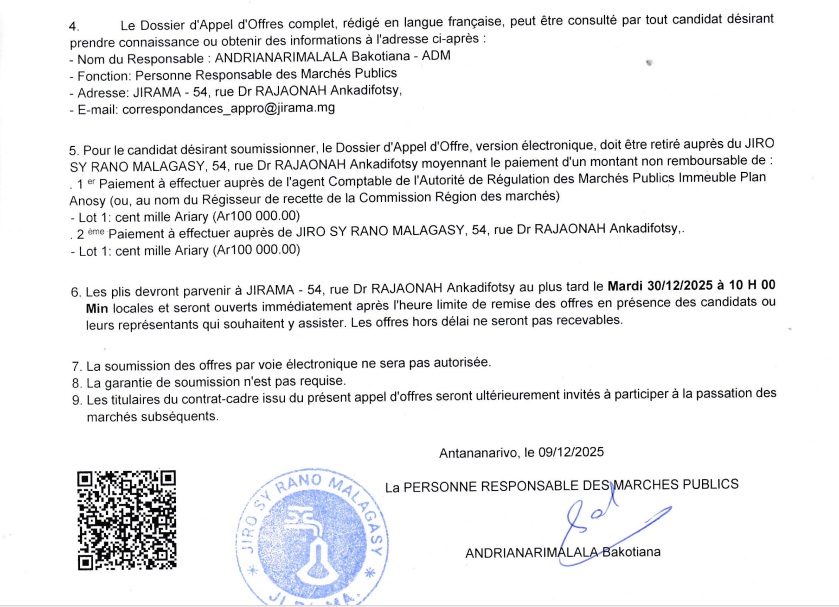Avis d’Appel d’Offres Ouvert International N°PAAEP – WJIR-T-016-25 – TRAVAUX D’A.E.P. POST CYCLONES DANS LES VILLES DE ANTSIRABE ET MANANJARY