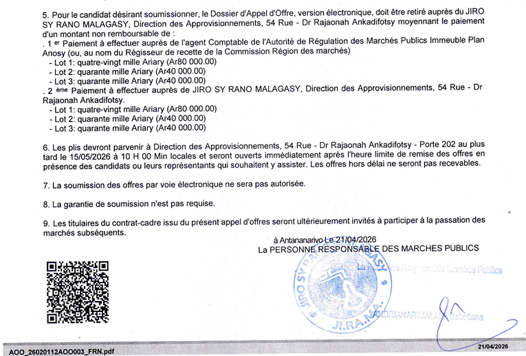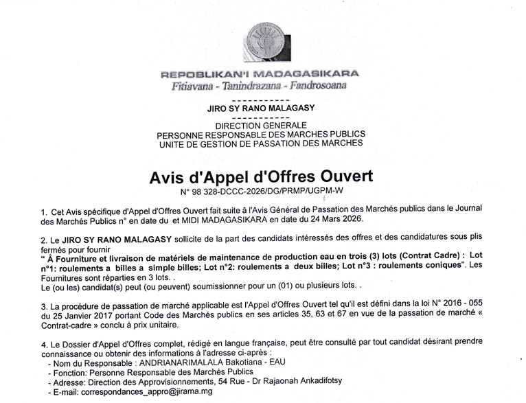 Avis d’Appel d’Offres Ouvert N° 98 328-DC CC.2O26/DG/PRMP/UGPM-W Fourniture et livraison de matériels de maintenance de production eau Publié le :24 avril 2026 98328-W-LOT1-2-3-AVIS-DAPPEL-DOFFRES_20260422_0001Télécharger