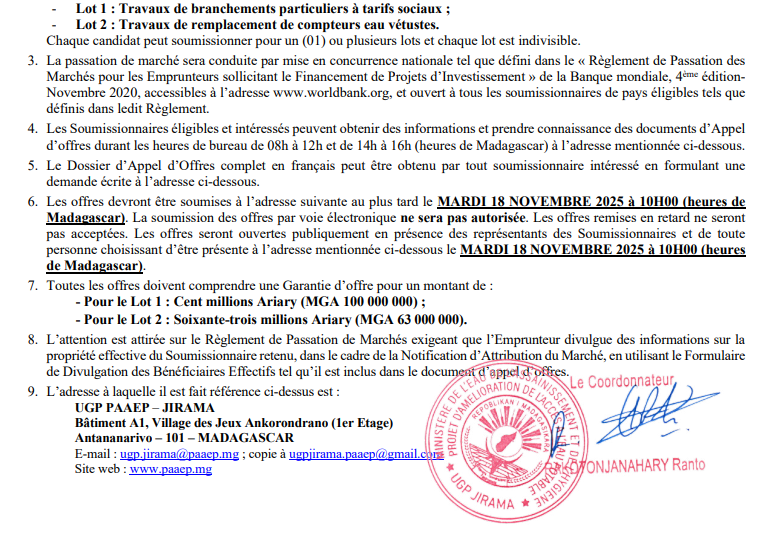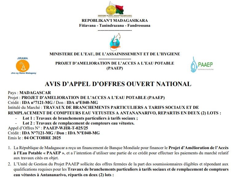 Avis d’appel d’offres ouvert N° PAAEP-WJIR-T-025/25 Travaux de branchements particuliers tarifs sociaux et de remplacement de compteurs eau vétustes Antananarivo Publié le :6 octobre 2025 Avis_Specifique_PAAEP-WJIR-T-025-25__BS-ET-REMPLACEMENT-CTR-VETUSTES-VFTélécharger
