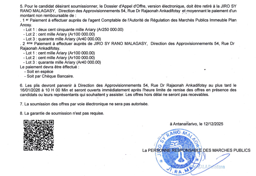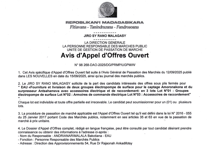 Avis d’Appel d’Offres Ouvert N°98 268-DAO-2O25/DG/PRMP/UGPM/W Fourniture et livraison de deux groupes électropompe de surface pour !e captage Amoronakona et du surpresseur Antsahameva avec accessoires électrique et de raccordement Publié le :12 décembre 2025 Avis-dAppel-dOffres-Ouvert-DAO-98268-WTélécharger