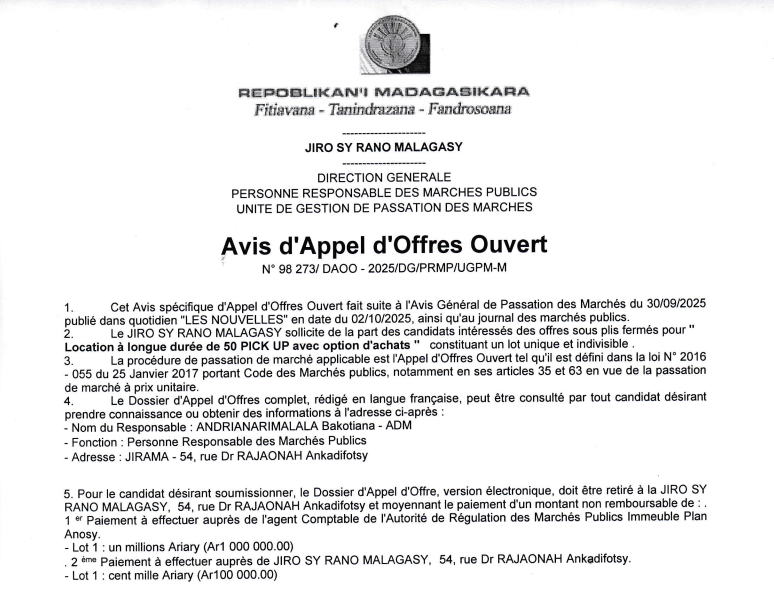 Avis d’Appels d’Offres Ouverts N° 98 273/DAOO-2025/DG/PRMP/UGPM/M portant Location à longue durée de 50 PICK UP avec option d’achat Publié le :15 décembre 2025 Avis-dappel-doffre-98-273-MTélécharger