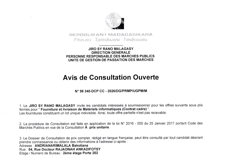 Avis de Consultation et d’appel d’offres N° 98 340/DCP-CC-2026/DG/PRMP/UGPM-M : Fourniture et livraison de matériels informatiques Publié le :3 avril 2026 Avis-de-consultation-98-340-MTélécharger