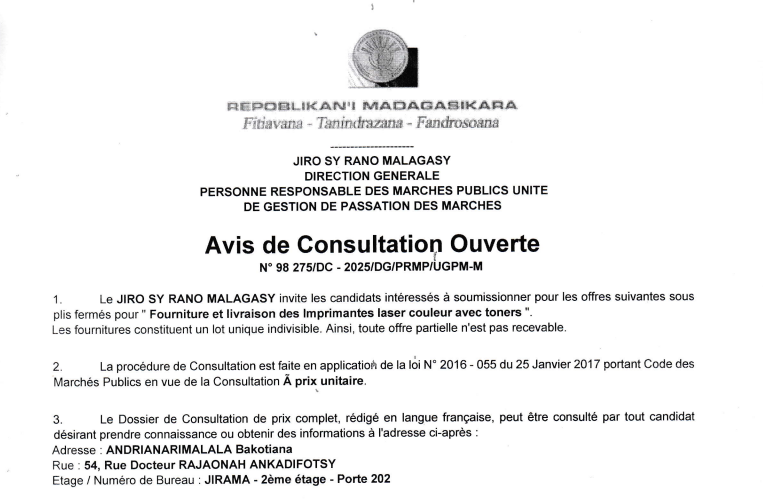 Avis de Consultation Ouverte N° 98 275lDC – 2025/DG/PRMP/UGPM-M Fourniture et livraison des Imprimantes laser couleur avec toners