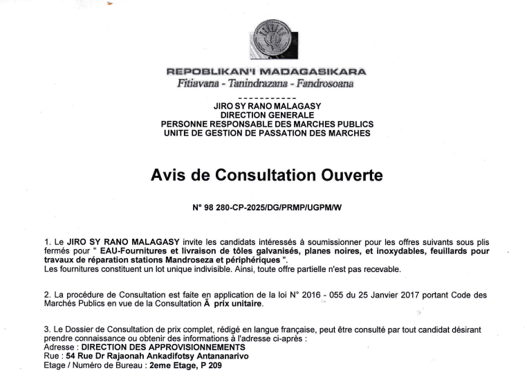 Avis de Consultation Ouverte N° 98 291 -CP-2025/DG/PRMP/UGPM/W EAU-Fourniture et livraison des matériels pour confection d’un radeau et outillages pour dragage manuel du lac Mandroseza