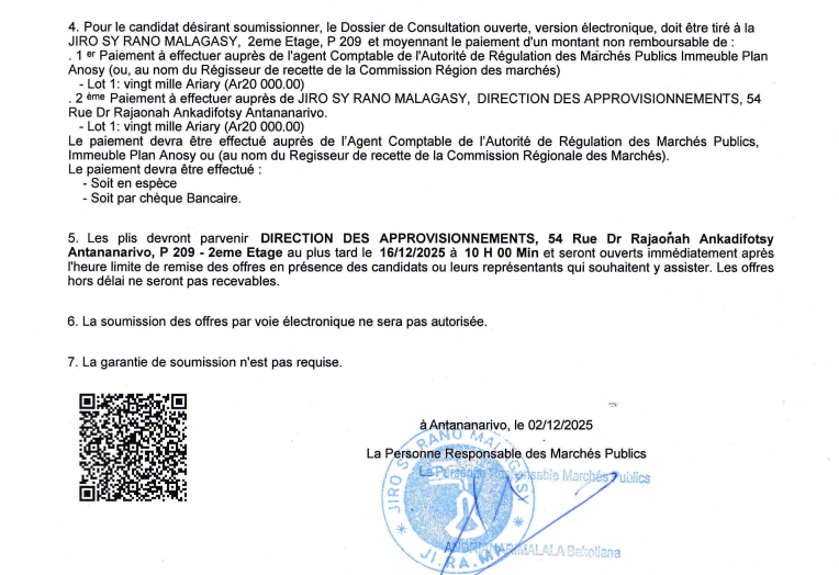 Avis rectificatif N°1 de l’Appel d’Offre Ouvert International AOI 98 261/2025/DG/PRMP/UGPM/E – Fourniture et livraison de Pièces consommables et de sécurité pour tous Groupes JIRAMA