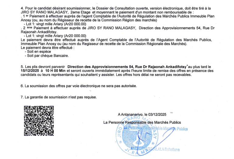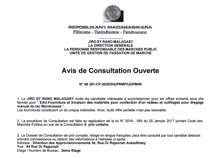 Avis de Consultation Ouverte N° 98 291 -CP-2025/DG/PRMP/UGPM/W EAU-Fourniture et livraison des matériels pour confection d’un radeau et outillages pour dragage manuel du lac Mandroseza Publié le :4 décembre 2025 AVIS-DE-CONSULTATION-OUVERTE-CP-98291-WTélécharger