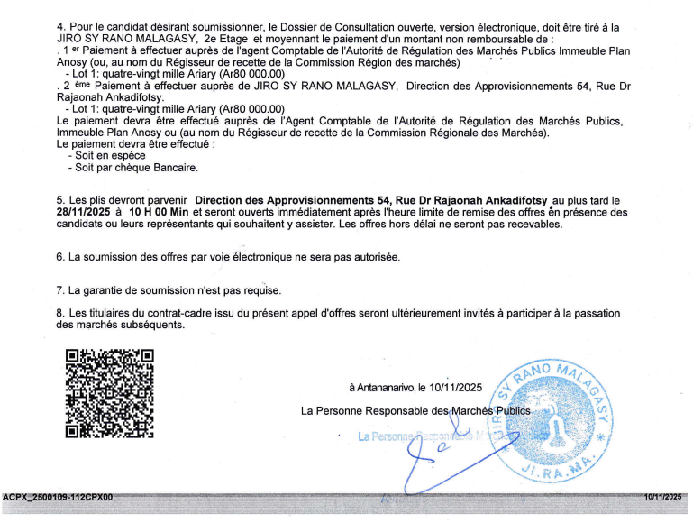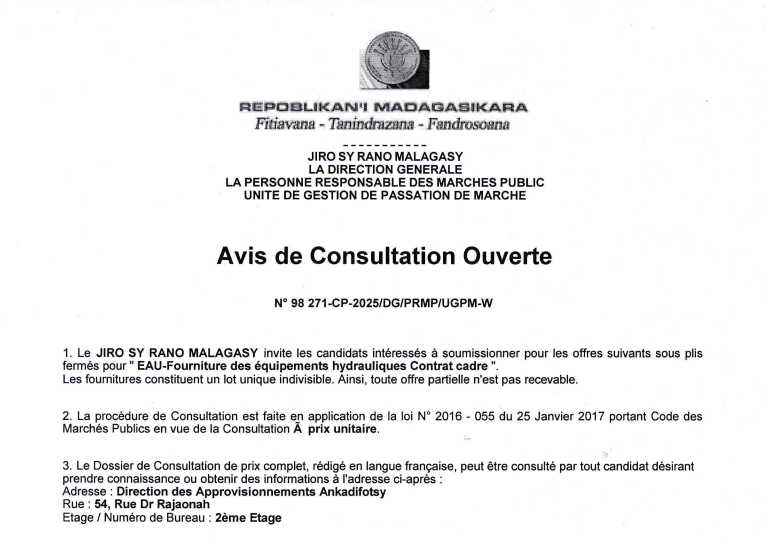Avis d’Appel d’Offres Ouvert N° AO 98 281/2025/DG/PRMP/UGPM/E – RELANCE : Prestation de réparation des Draisines de la JIRAMA