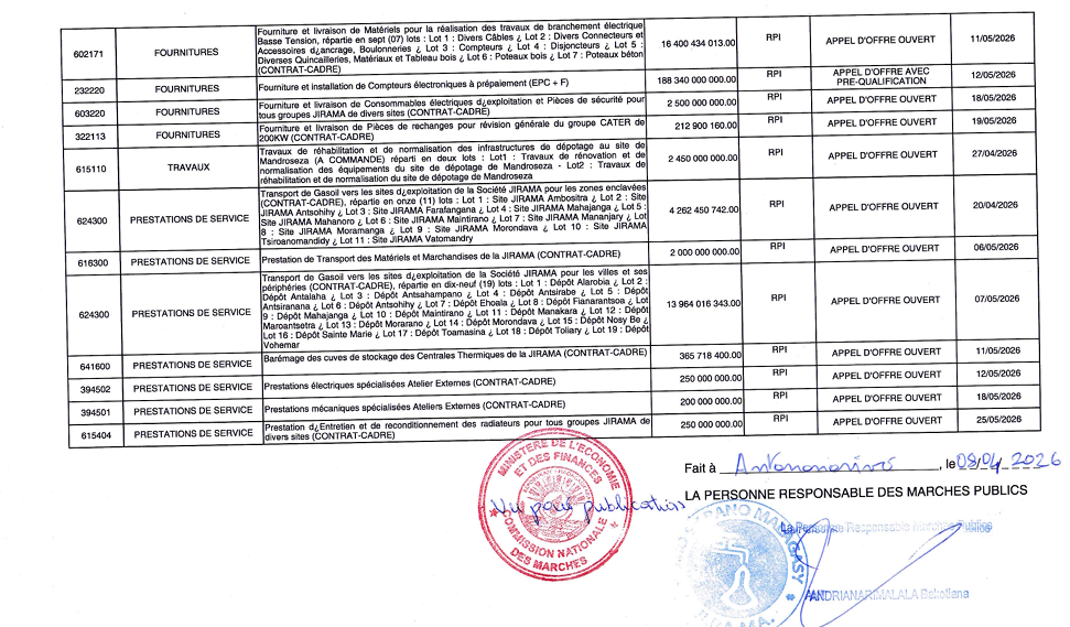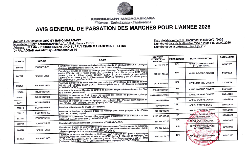Avis Général de Passation des Marchés 2026 Mise à Jour N°2 pour l’Activité Electricité