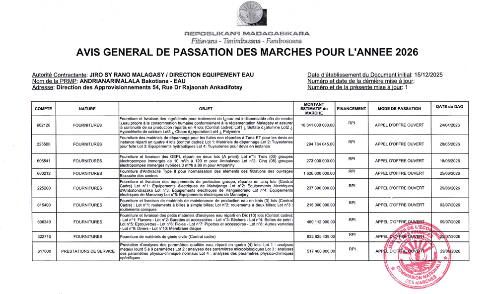Avis d’Appel d’Offres Ouvert N° AO 98 334/2026/DG/PRMP/UGPM/E : Prestation de réparation des Draisines de la JIRAMA