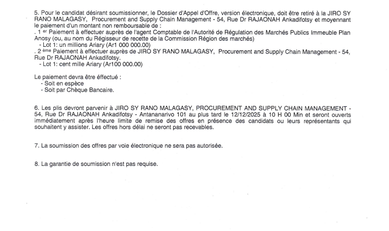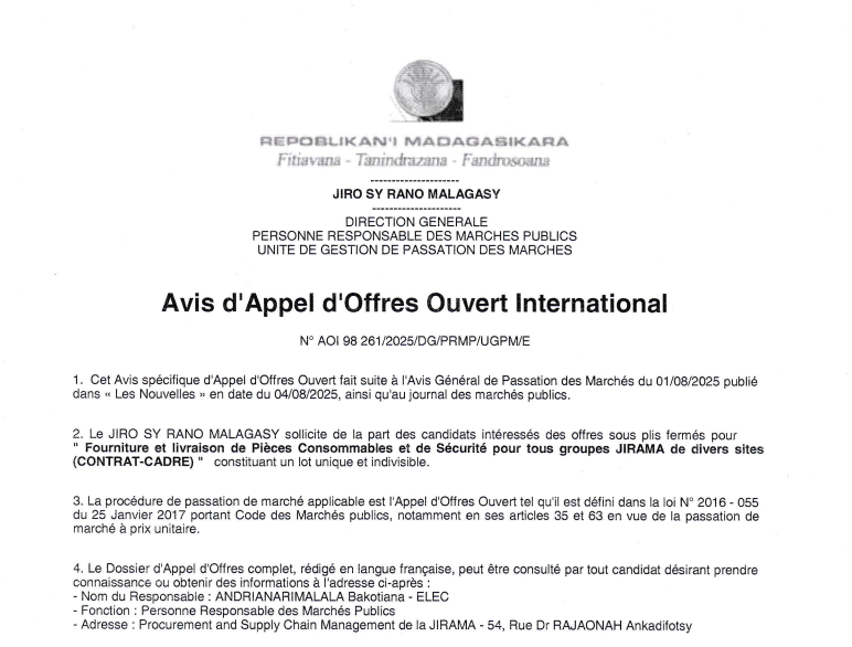 Avis d’Appel d’Offres Ouvert International N°PAAEP – WJIR-T-006-25 – TRAVAUX D’INSTALLATION DES POMPES, RENFORCEMENT DES CONDUITES DE TRANSFERT VERS ANKATSO, CAMPUS, AMBOHIDEPONA ET AMORONAKONA (BRETELLE) ET TRAVAUX DE MISE EN PLACE DE DEUX DECANTEURS LAMELLAIRES A MANDROSEZA II ET II BIS