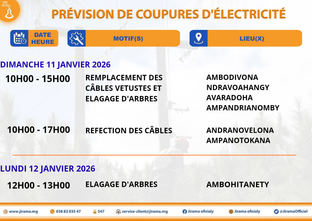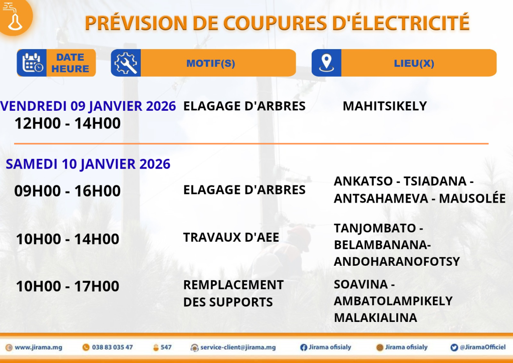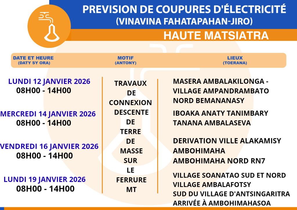 PRÉVISIONS DE COUPURES D’ÉLECTRICITÉ venant de la Direction RIA et région Haute Matsiatra du 09 au 19 janvier 2026 Publié le :8 janvier 2026