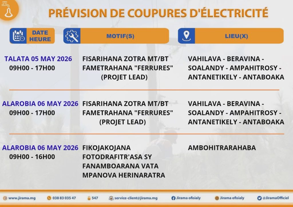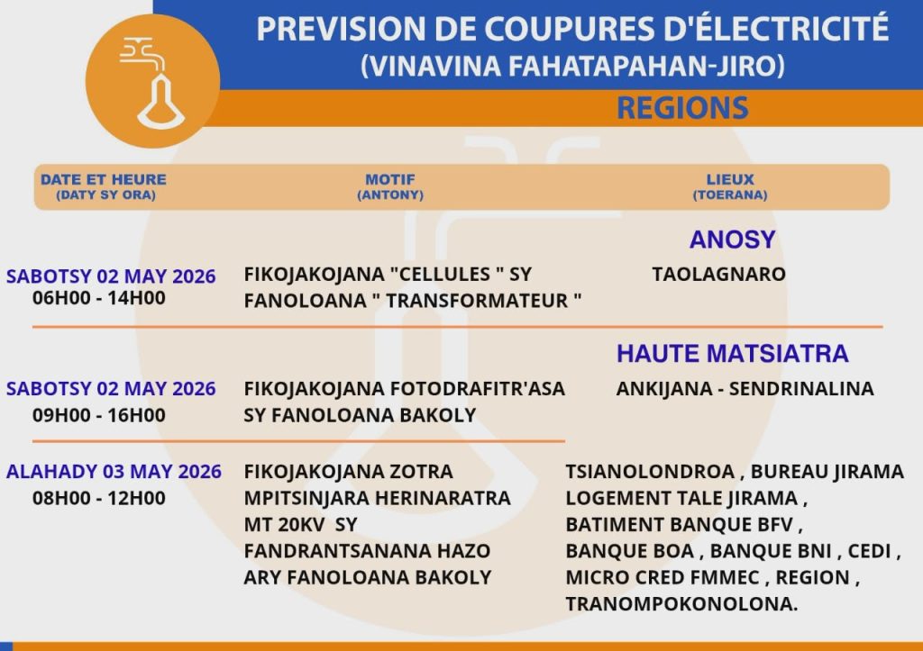 Prévisions de coupures du 01 au 07 mai 2026 venant de la Direction RIA et régions Anôsy_Haute Matsiatra Publié le :29 avril 2026