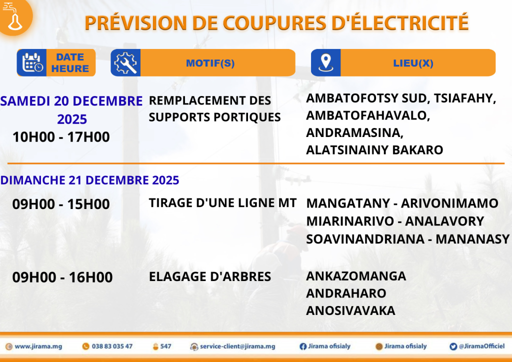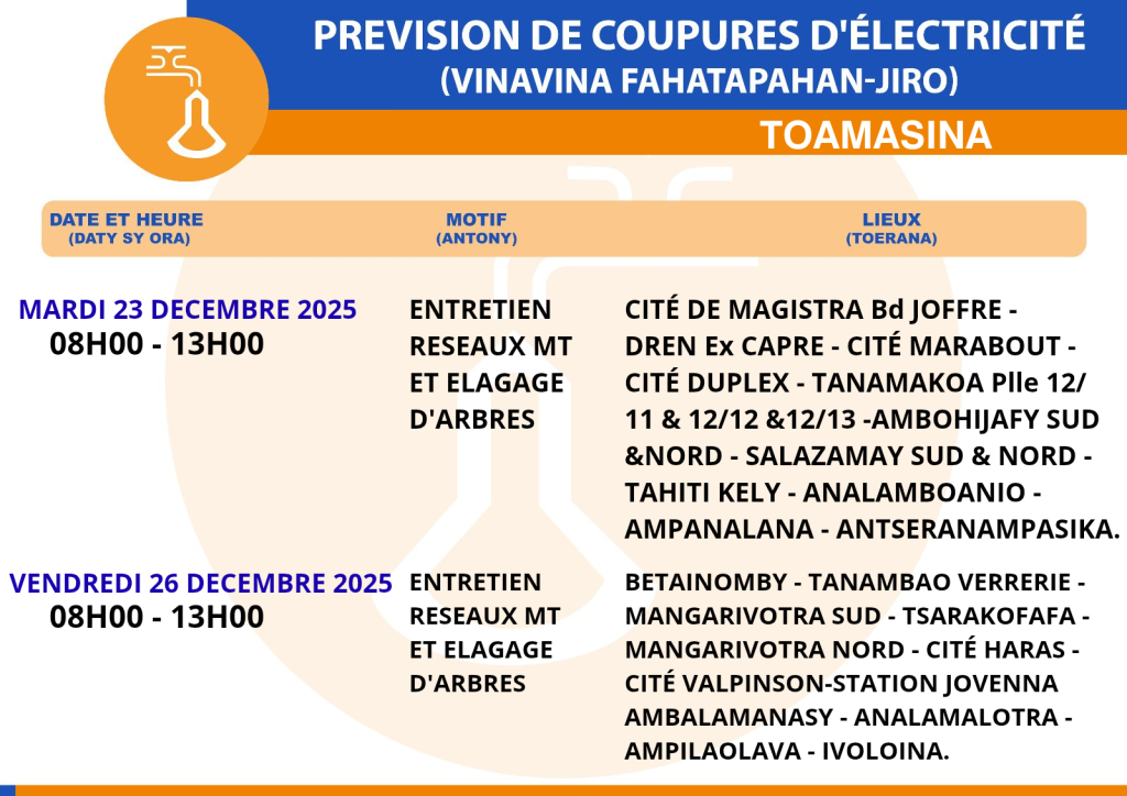 Prévisions de coupures du 19 au 26 décembre 2025 Direction RIA et région Toamasina.