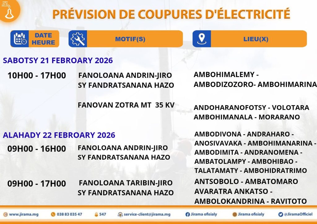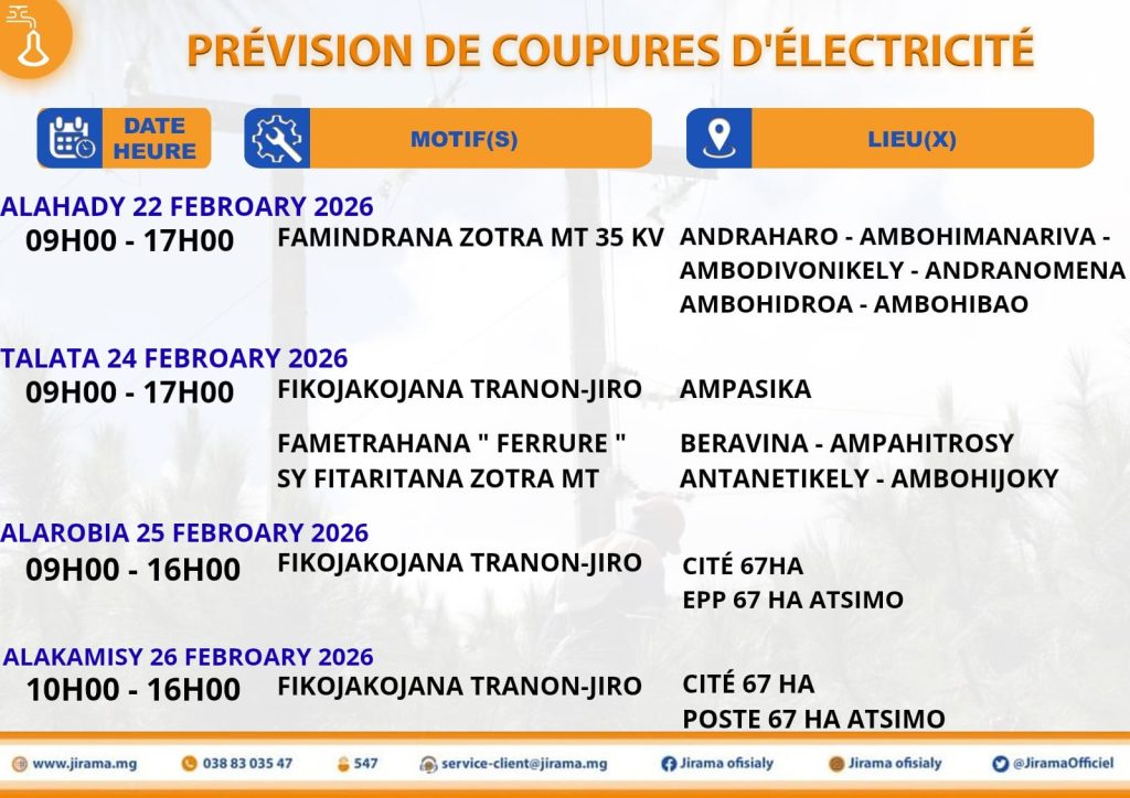 Prévisions de coupures du 20 au 26 février 2026 venant de la Direction RIA d’Antananarivo et de la Direction Régionale de la Haute Matsiatra