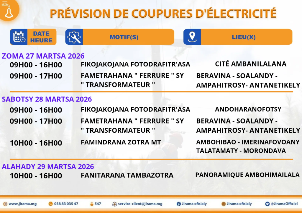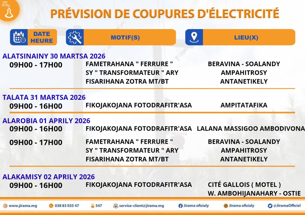 Prévisions de coupures du 27 mars au 02 avril 2026 venant de la Direction RIA Publié le :26 mars 2026