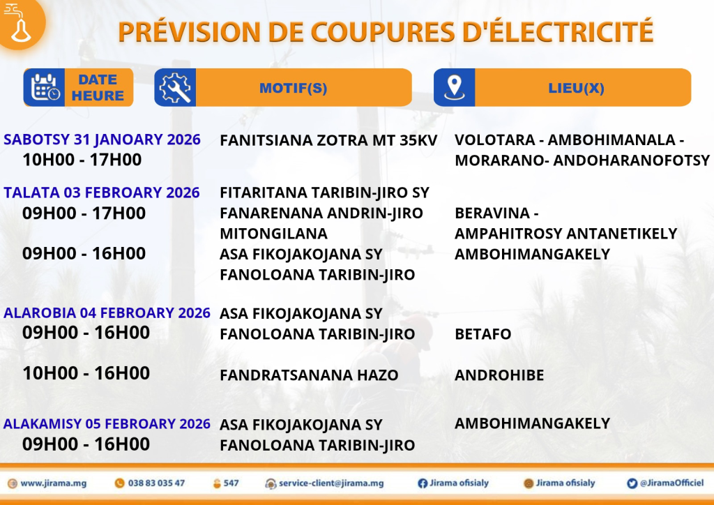 PRÉVISIONS DE COUPURES D’ÉLECTRICITÉ venant de la Direction RIA et région Haute Matsiatra du 09 au 19 janvier 2026